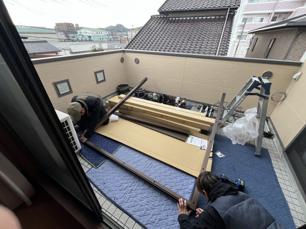 福岡市南区にて玄関ドアを取替中、アルミ額縁で既存ドアをカバー