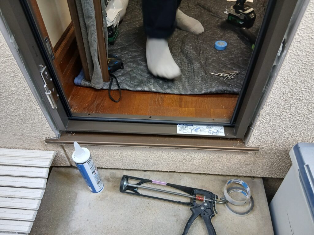 新しいドア枠が付いたら外側に外額縁というアルミのモールを取付して外壁との間にコーキングを入れていきます。