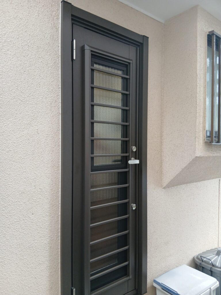 ②ドアに格子が付いていて、室内から上下に動かすことができ通風もできる勝手口ドアに取替をする