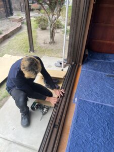 一つづつ丁寧に下枠に当たるのを確認しながら固定していきます。既存の窓がYKKAPの窓で色がブラウンでしたので今回の樹脂窓ハイブリッド枠も外はブラウンを選択したのでどうメーカーの為全く外側から見て違和感がありません!他メーカーの場合はできるだけ近い色をオススメさせていただいてます。
