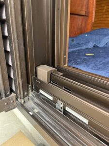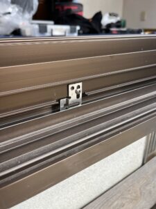1番初めの現地調査時にこの大きな窓は開閉が歪みで重たく、レールも少し削れていたのでお客様のお悩みもきちんと解決するためにこの小さなステンレスの部材の固定が重要です!