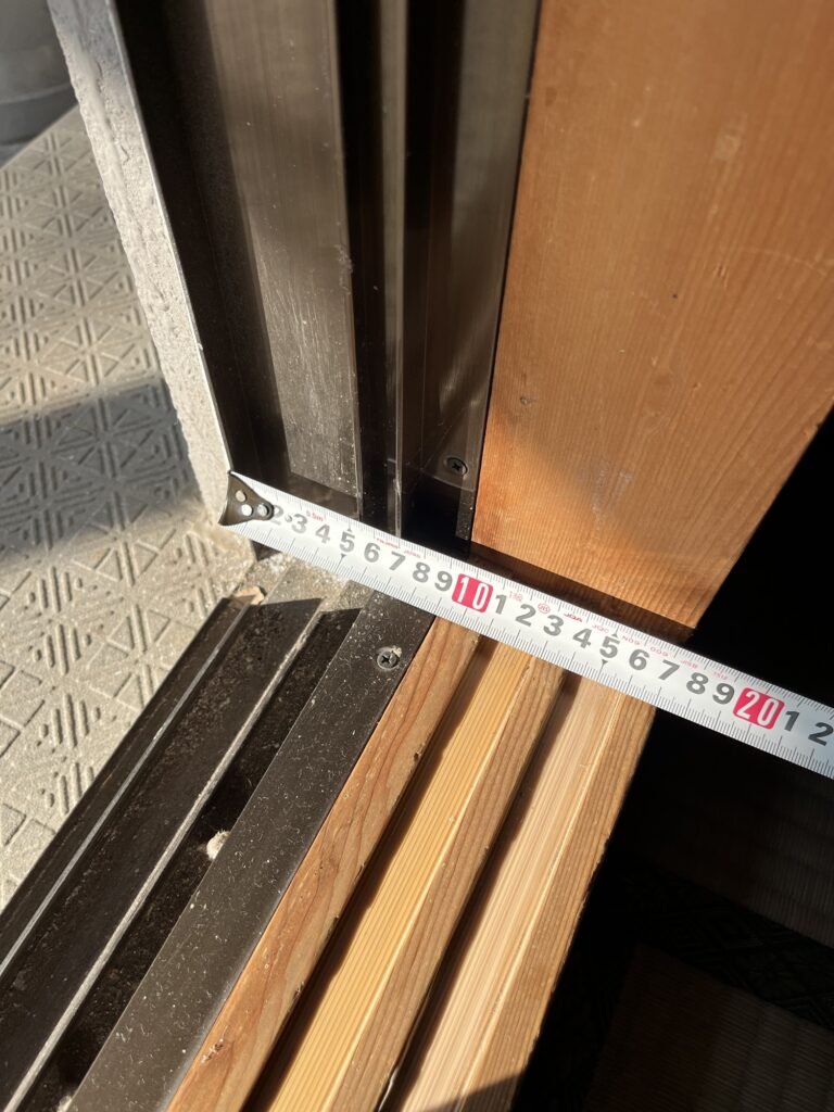 マンション用マドリモの場合は既存の窓の幅(今回でいえば7センチ)+窓のアングルと呼ばれる窓と木枠を固定しているアルミの幅(今回は2センチ)+室内側の木の部分がどれだけあるかで部材の選定が変わります!こちらの窓の場合はすべての部材の合計幅が約17センチほどあります!