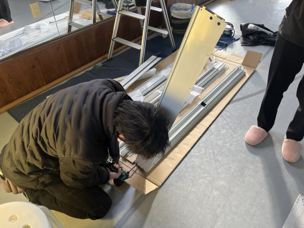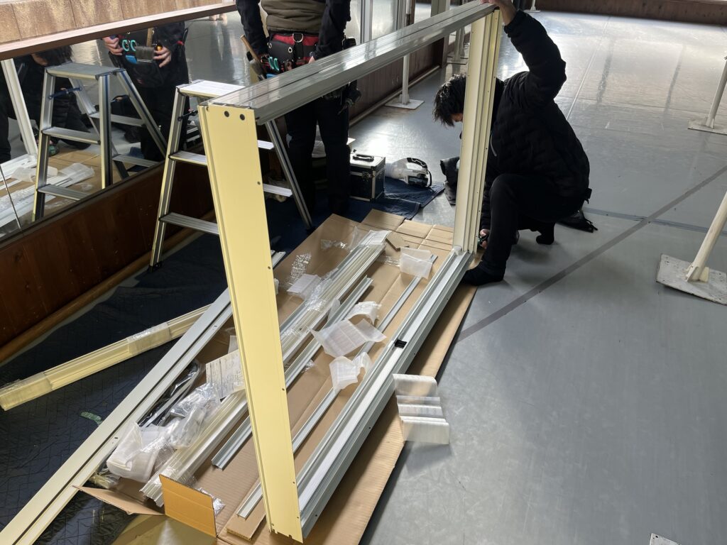 シートを貼っている間に新しいYKKAPの断熱窓樹脂窓ハイブリッド専用枠を組み立てて行きます。新しい枠は弊社工場で事前に組んできたり、現地にて組み立てたりと状況に応じて変化します。