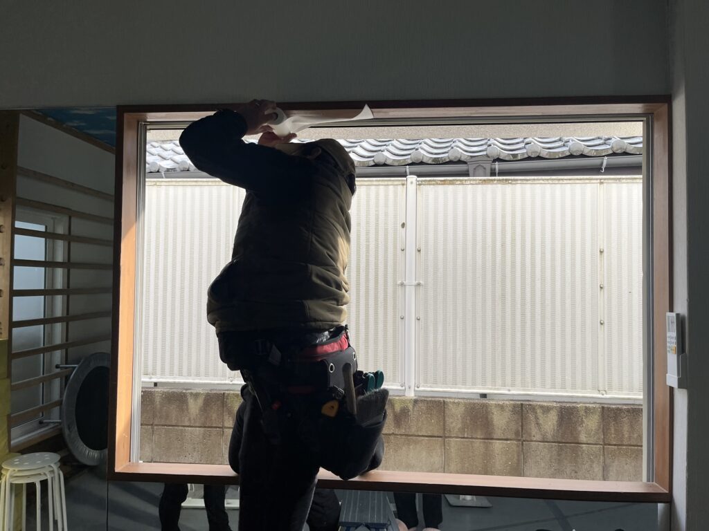 新しい枠を組み立て終わったら先ほどの気密シートを貼った窓枠内に嵌め込んで作業を進めていきます!