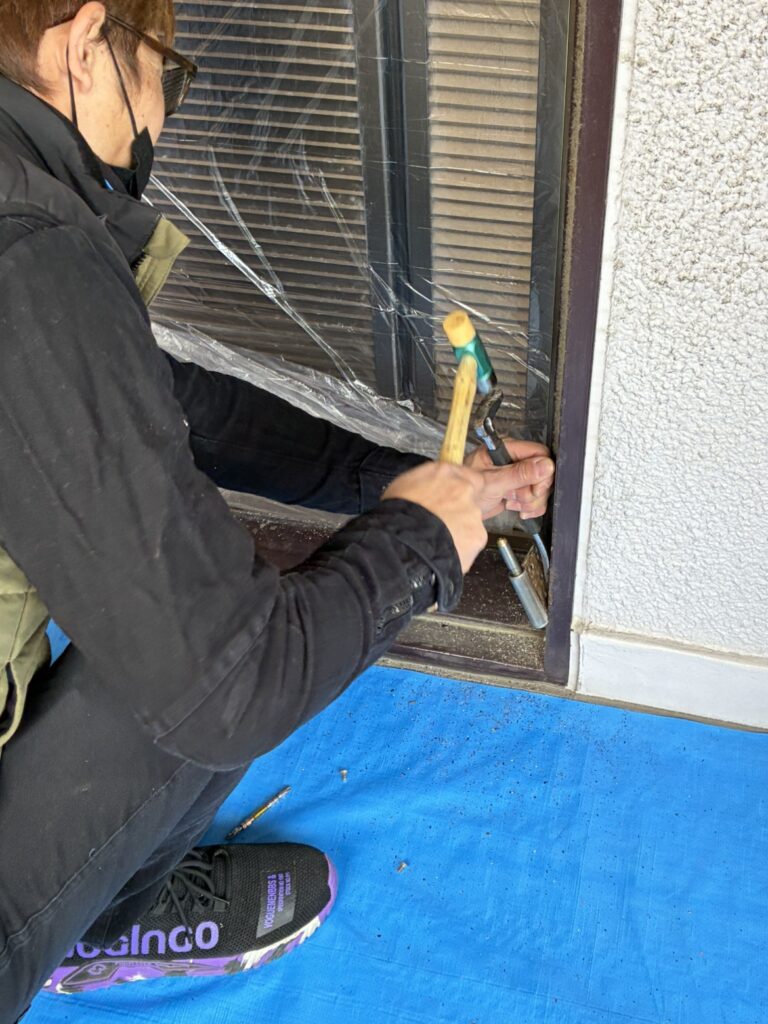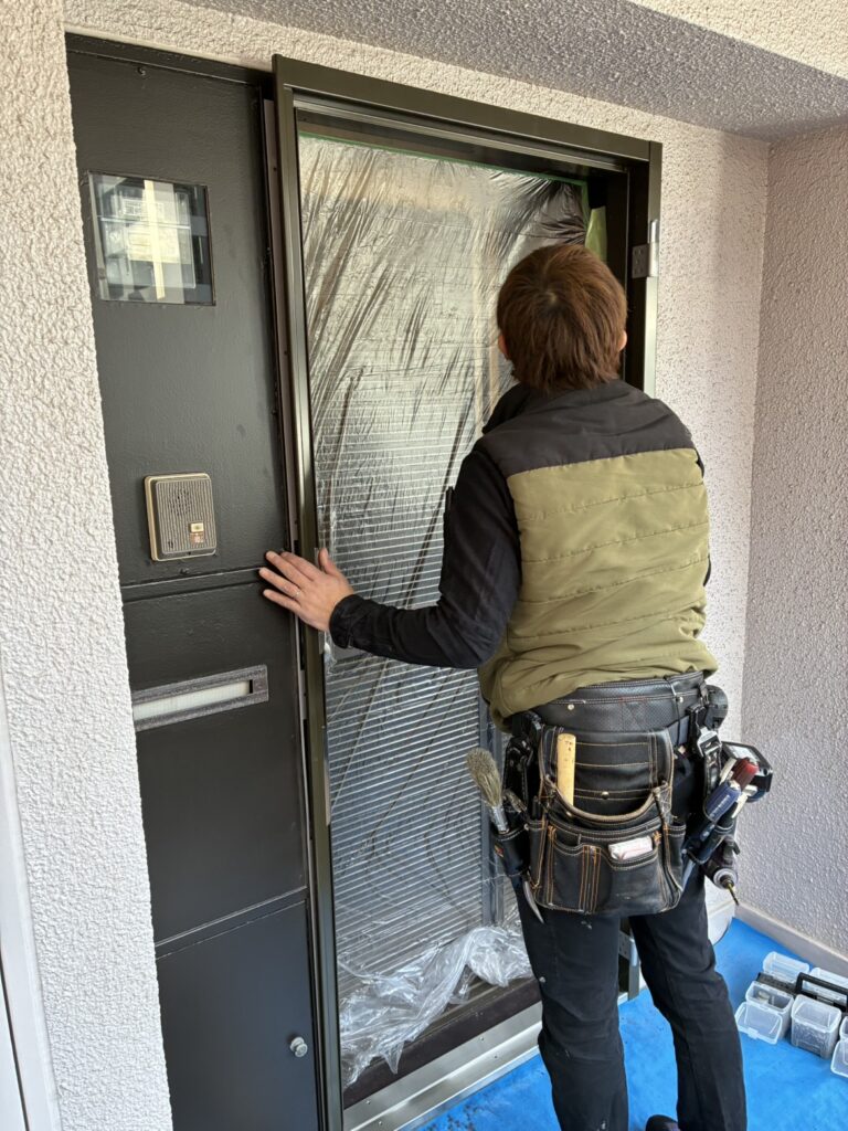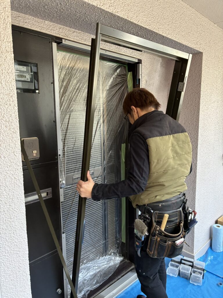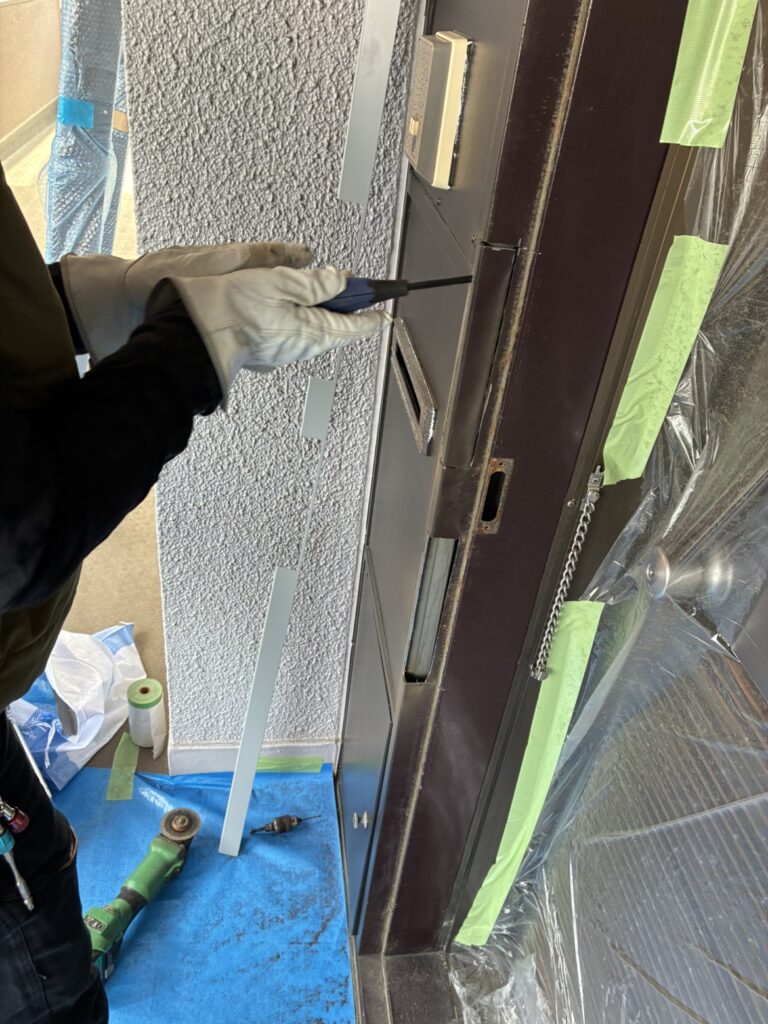 まず最初に行うのが、既存の玄関ドア本体の取り外しです。ドア本体や金物を丁寧に取り外し、次の工程に備えます。
