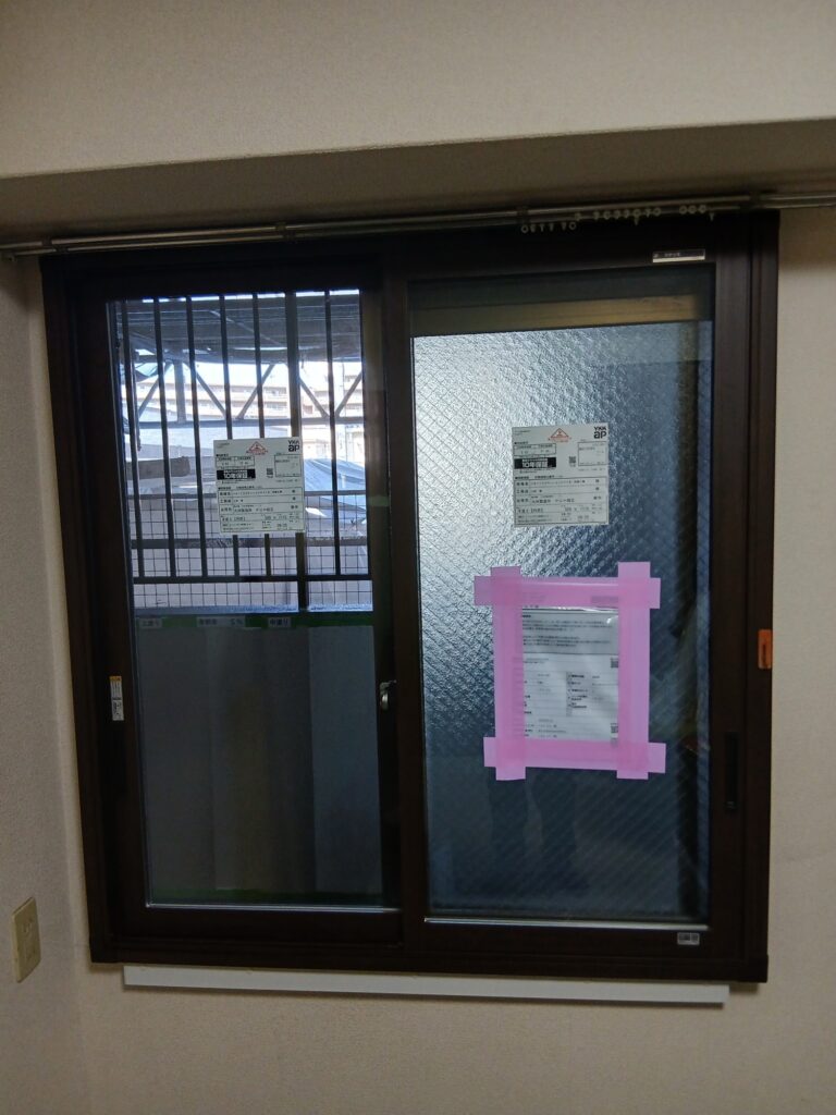 廊下側の窓には光が入らず、寒さに困っている様子でした。ガラスに網入りガラスでサッシは防火仕様の窓となっているので、窓のカバー工法をする時は防火仕様の窓を使わないといけないので注意が必要です。