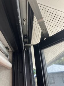 現地調査にお伺いした時にたてすべり窓の上部のアームの樹脂部品が壊れていることを確認いたしました。