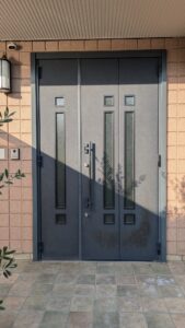 既存のドアは親子ドアの手動タイプがついておりました。ドアの表面に白くなる腐食が確認できました。