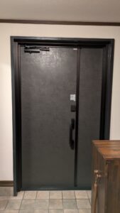 ドアリモ工事後の室内側の写真です。無採光なので一切光が入らずマンションやホテルの一室のようなイメージでした。ハンドルの上の黒の資格のボックスは電池錠の電池が入っています。