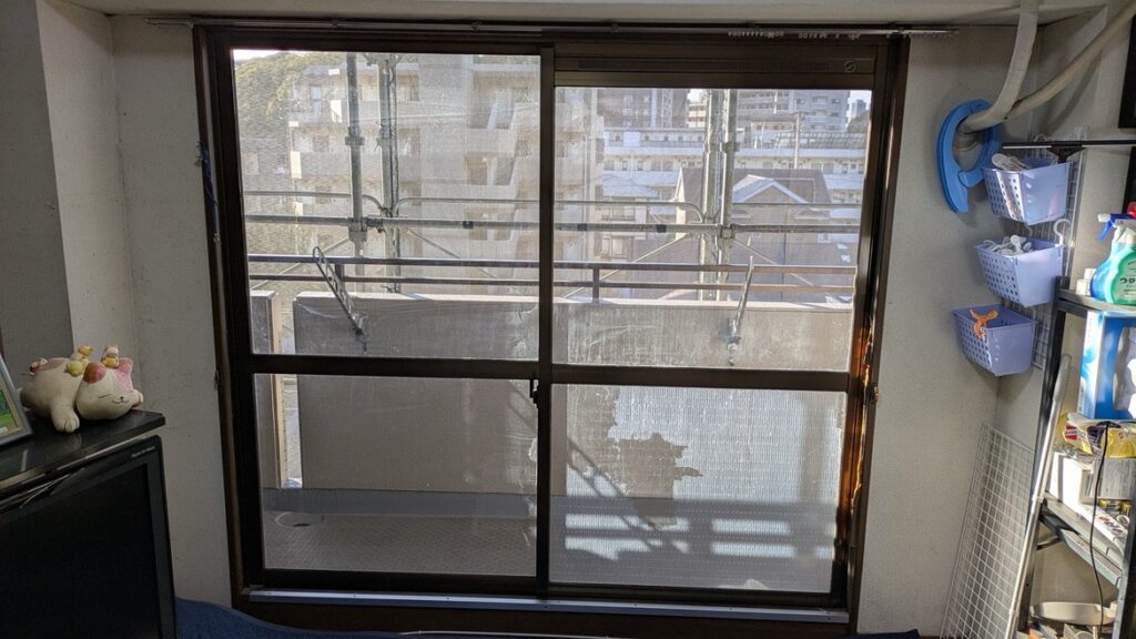 大規模修繕では既存的に外壁塗装と屋上やバルコニー、廊下の防水がメインなっています。今回はマンションの希望者のみ戸別に窓リフォームでした。