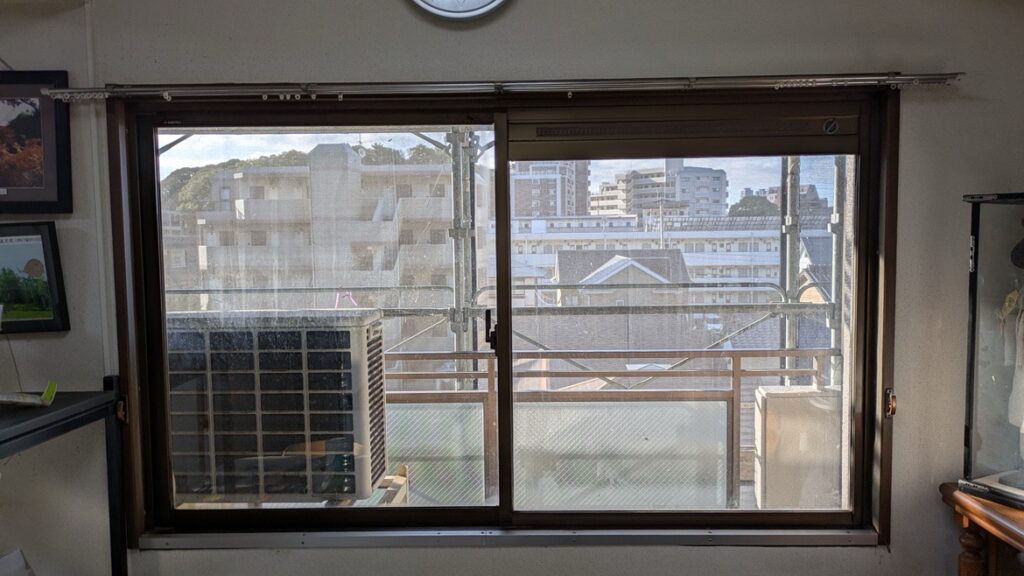 既存のリビングの窓一枚ガラスのアルミサッシでした。右側のガラスの上部には換気するための換気框がついていました。