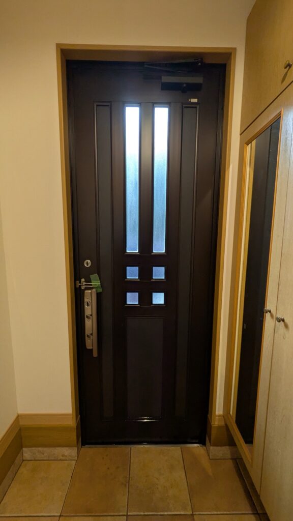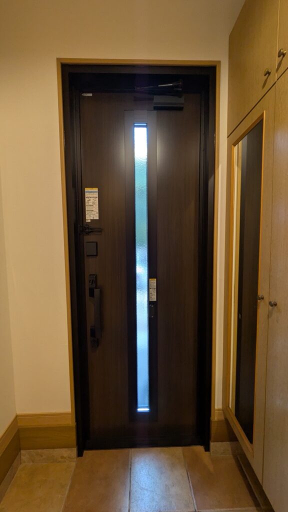 ドアリフォーム後は一回り小さくはなりますが、開閉はスムーズでリモコンで開閉できるポケットキー仕様にしたので便利になりました。電池は室内側にあり(ハンドルの上の四角の黒い箱)、交換は蓋を開けて電池を変えるだけなので簡単に取替ができます。