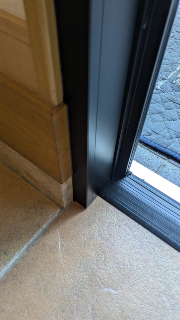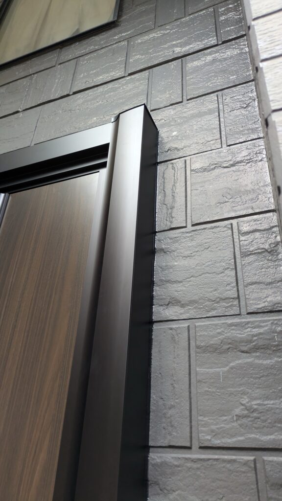 外側も既存のドア枠を覆うカバーがつき、外壁との間にはコーキングという外壁とのアルミのカバー枠を繋ぐボンドのような材料を使って作業します。