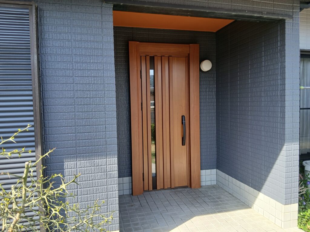 完成後のドアの写真です。玄関上部の軒天ともドアの色がマッチしており、素敵なドアになりました!