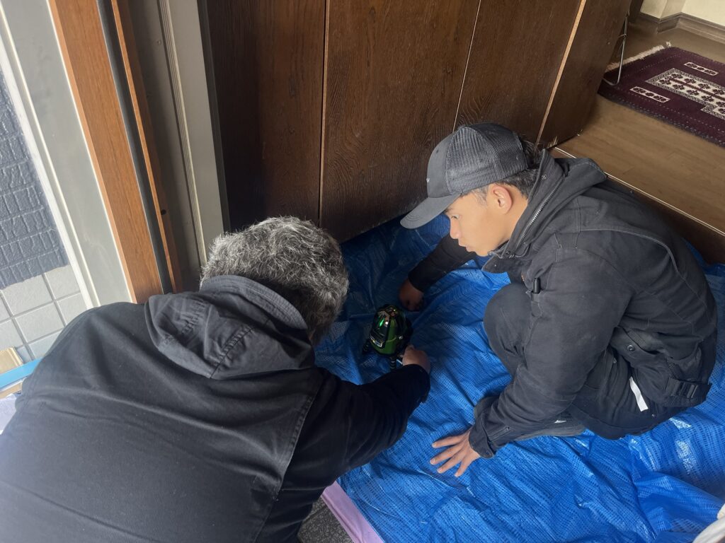 新設枠を既存ドア枠にはめてレーザーレベルを見ながらスペーサー等を入れて水平等を調整していきます。