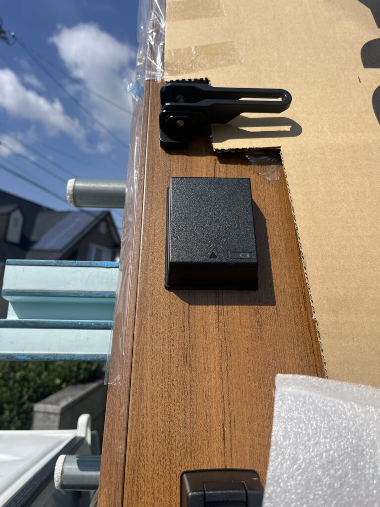 こちらの黒い箱型のものはドアリモ玄関ドアの電池錠タイプの室内側の電池が収納されているボックスとなります!下から上にスライドすると箱が開き、電池の交換が可能です。電池交換が必要な時にはランプでお知らせしてくれますのでご安心ください!