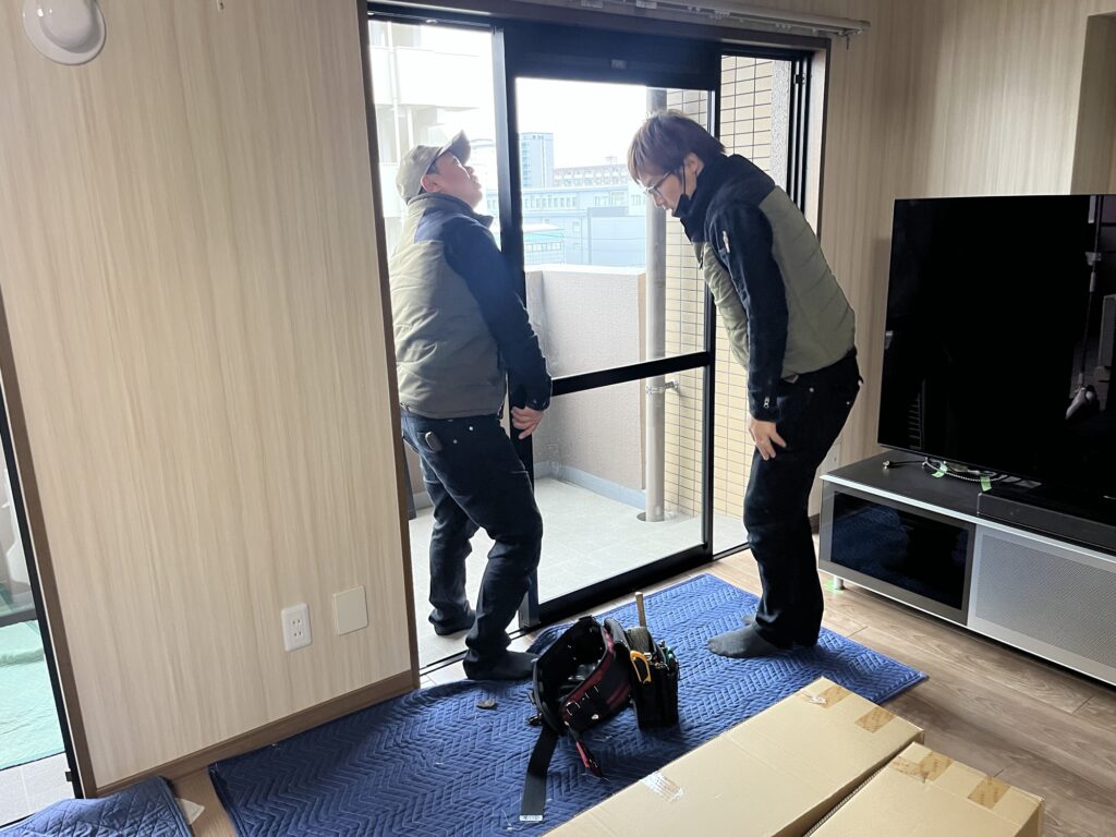 今回は窓リノベ補助金2026を活用してマンションの窓の取替です。内窓(二重窓)は2度開ける開閉がストレスと感じることが多いのも事実としてあります。マンションは特に2人で窓リフォーム作業をすることで効率よく、安全に工事ができます。職人さんがもっているガラス上部の黒くて太いフレーム部分が換気かまちとなっています。