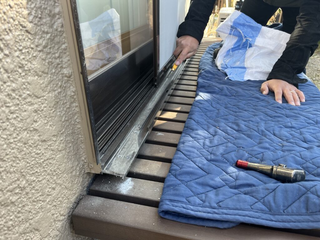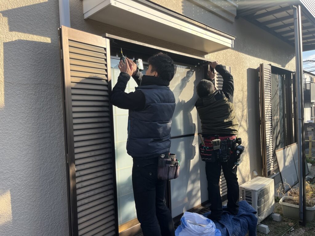 オーダーしているシャッターの寸法を確認したら既存の雨戸の解体に入ります。ビスをはずして取り外せるアルミの部材をどんどん解体していきます。