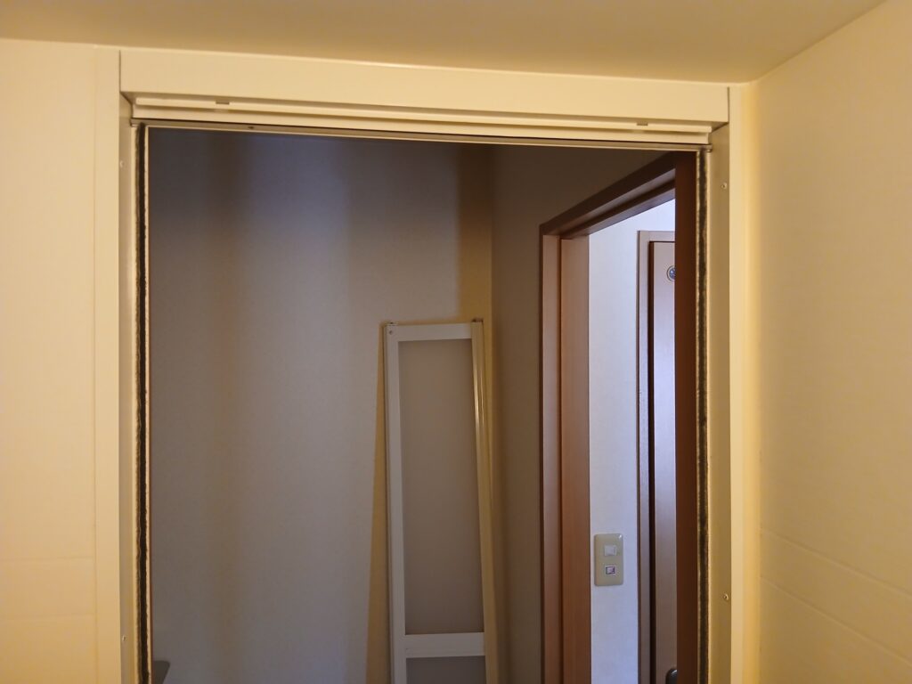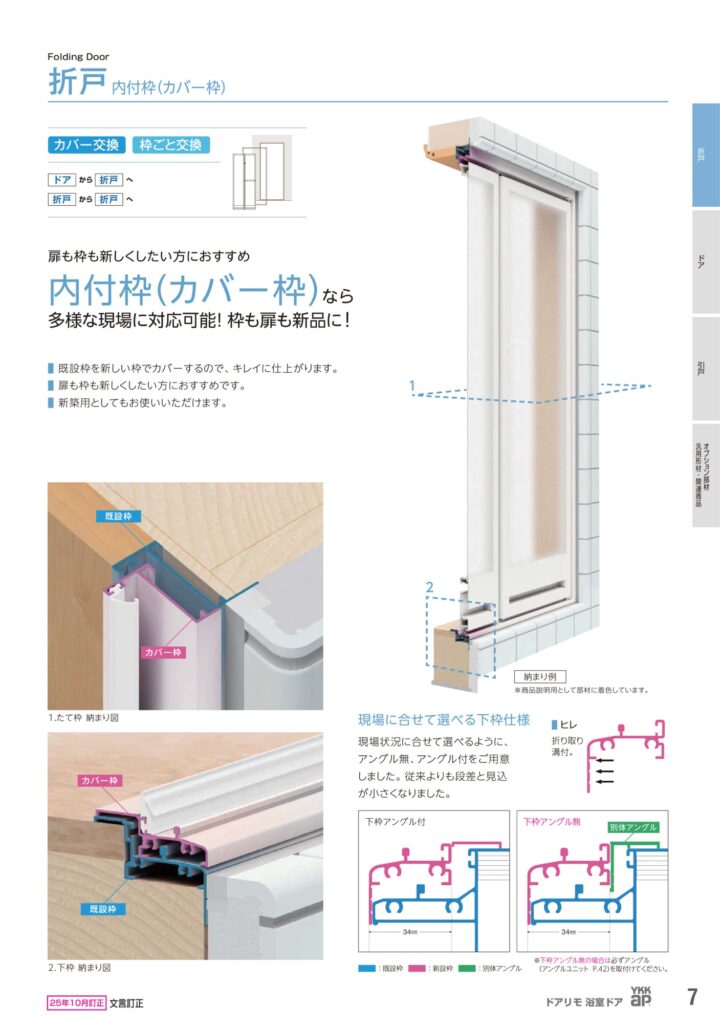 やり方としては今のドアや折戸の枠は外さずに枠の中に少し小さくした枠と扉を取り付けする『カバー工法』となります。