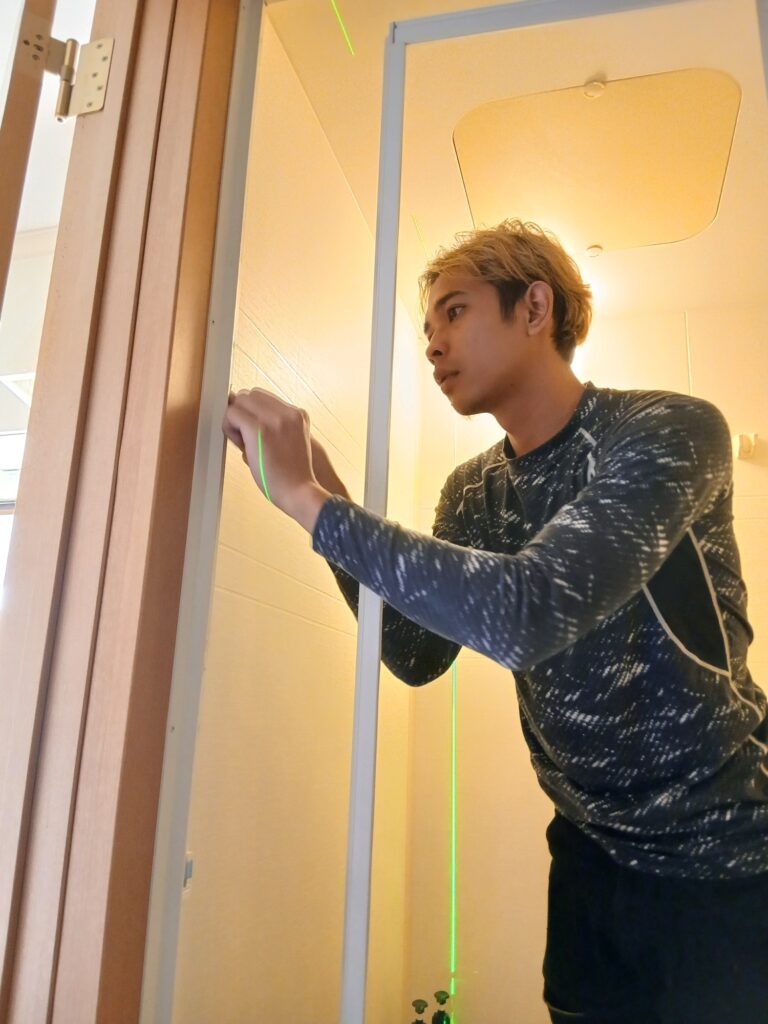 新しい枠をただ取り付けするのではなく水平に取り付けするようにレーザーレベルを使ってスペーサー等を活用しながら作業します。